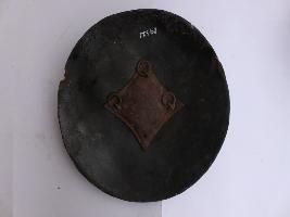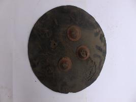 | Description / विवरण | A medium, circular and slightly convex shield of iron alloy. There are three small gilded knobs in the center and the back side of is padded between the knobs but it is damaged and grip is intact. Front is badly rusted and the edges are rough. Back is also polished in black colour and there is some rusting. |