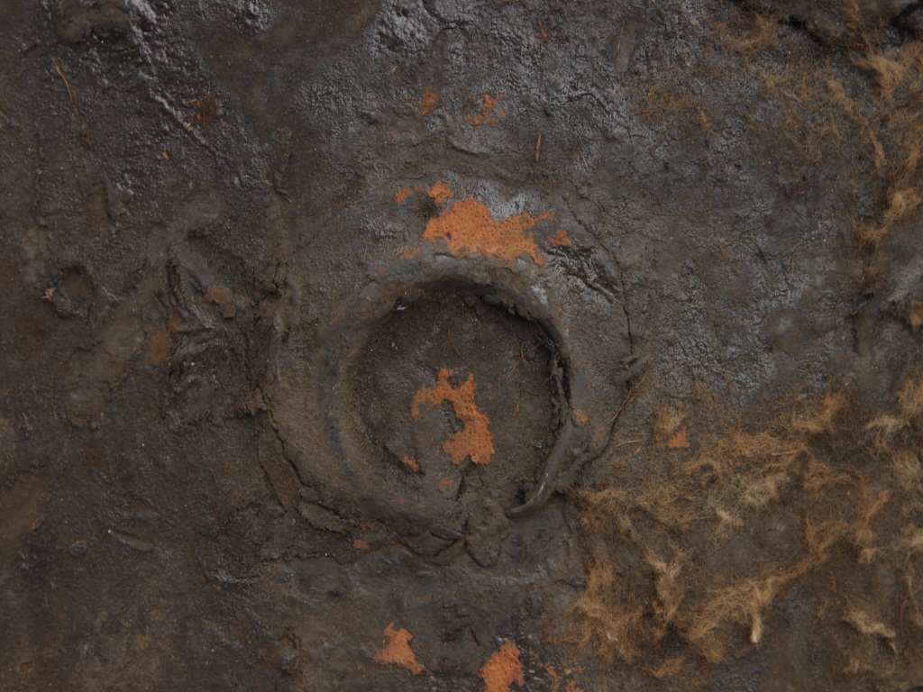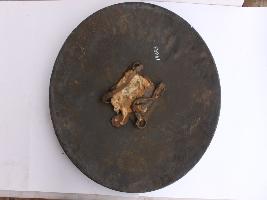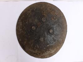 A medium, circular and slightly convex shield of iron alloy. There are four small gilded knobs in the center and the back side of is padded between the knobs. Front is badly rusted and the edges are rough. Back is also polished in black colour and there is some rusting.