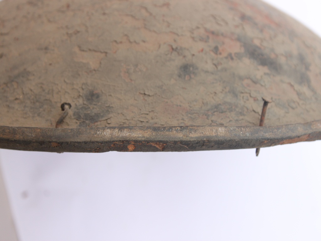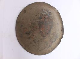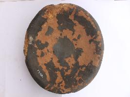 A medium, circular and slightly convex shield of iron alloy. But knobs and pad is missing. Front is badly rusted and the edges are rough. Back is also polished in black colour and there is some rusting.