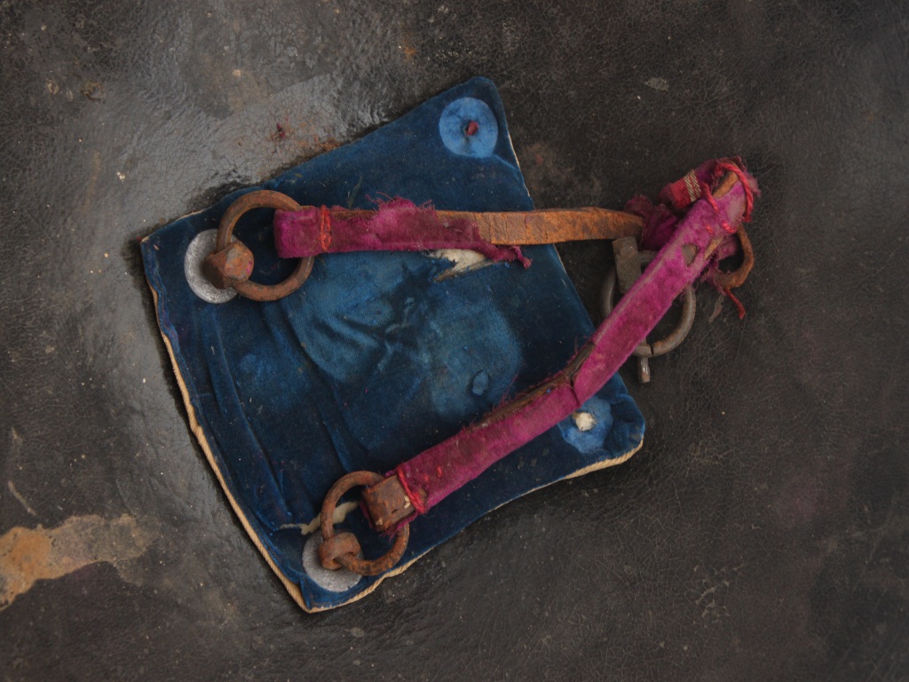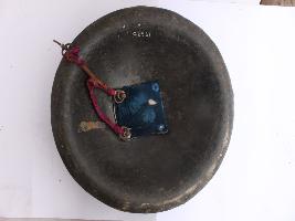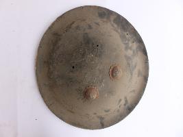 A medium, circular and slightly convex shield of iron alloy. There are two small gilded knobs in the center and the back side of is padded between the knobs but it is damaged and grip is intact. Front is badly rusted and the edges are rough. Back is also polished in black colour and there is some rusting.