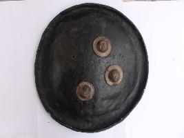 | Description / विवरण | A medium, circular and slightly convex shield of iron alloy. There are three small gilded knobs in the center and the back side of is padded between the knobs but it is damaged and grip is intact. Front is badly rusted and the edges are rough. Back is also polished in black colour and there is some rusting. |