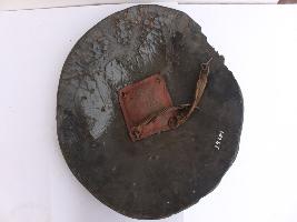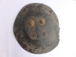 | Description / विवरण | A medium, circular and slightly convex shield of iron alloy. There are two small gilded knobs in the center and the back side of is padded between the knobs but it is damaged and grip is intact. Front is badly rusted and the edges are rough. Back is also polished in black colour and there is some rusting. |