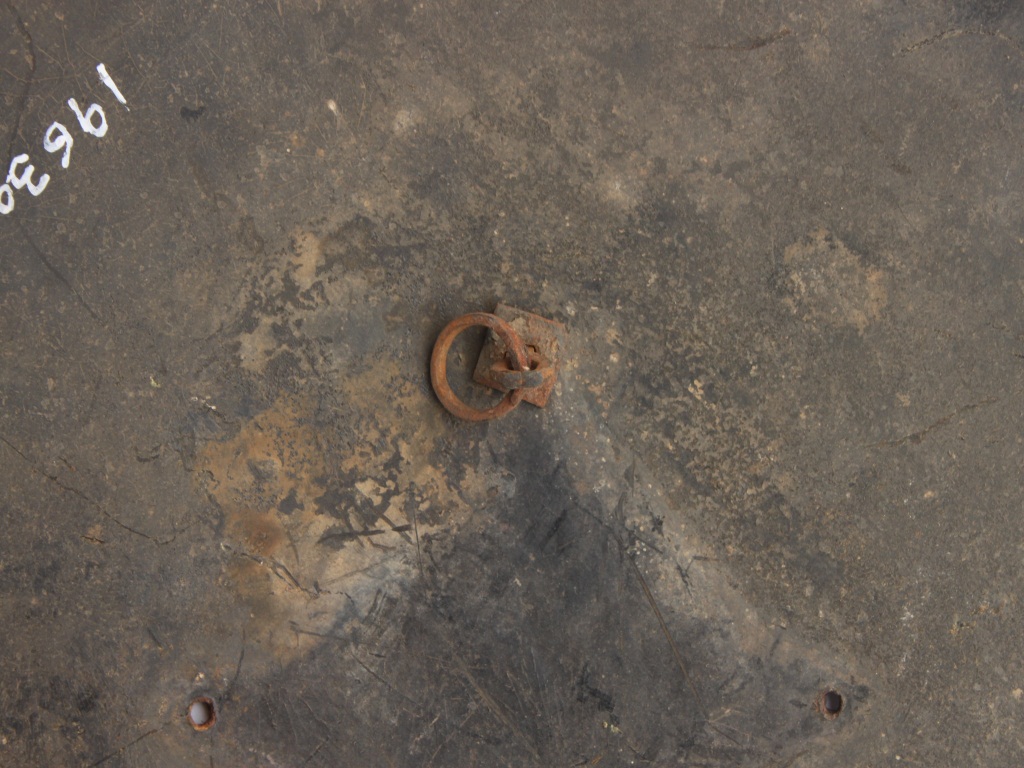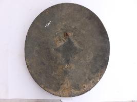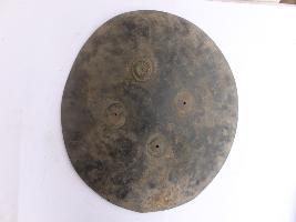 A medium, circular and slightly convex shield of iron alloy. There are one small gilded knob in the center and the back side of is padded between the knobs but it is damaged and grip are missing. Front is badly rusted and the edges are rough. Back is also polished in black colour and there is some rusting.