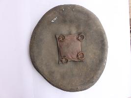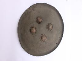 | Description / विवरण | A medium, circular and slightly convex shield of iron alloy. There are four small gilded knobs in the center and the back side of is padded between the knobs. Front is badly rusted and the edges are rough. Back is also polished in black colour and there is some rusting. |