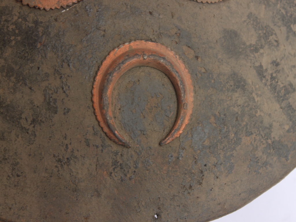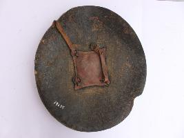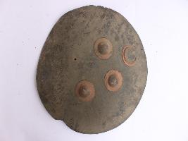 A medium, circular and slightly convex shield of iron alloy. There are three small gilded knobs in the center and the back side of is padded between the knobs but it is damaged and grip is intact. Front is badly rusted and the edges are rough. Back is also polished in black colour and there is some rusting.