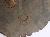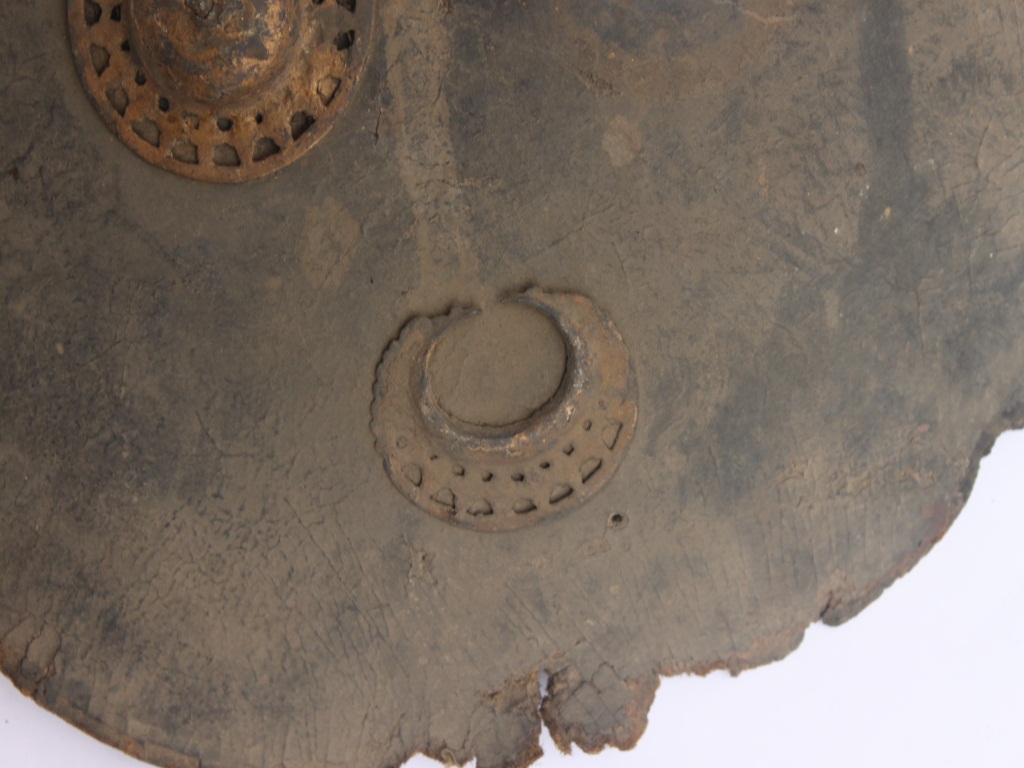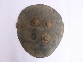 A medium, circular and slightly convex shield of iron alloy. There are three small gilded knobs in the center and the back side of is padded between the knobs but it is damaged and grip is missing. Front is badly rusted and the edges are rough. Back is also polished in black colour and there is some rusting.