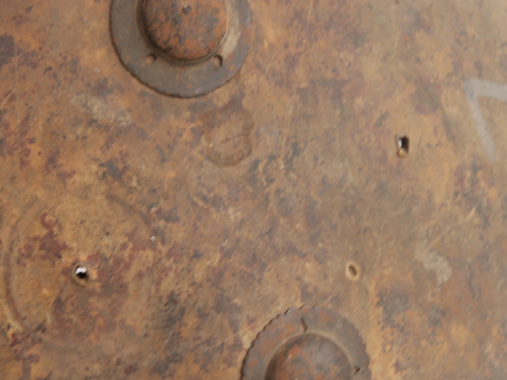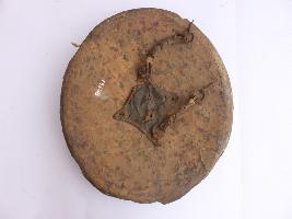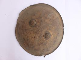 A medium, circular and slightly convex shield of iron alloy. There are four small gilded knobs in the center but they are of two different shapes and the back side of is padded between the knobs. Front is badly rusted and the edges are rough. Back is also polished in black colour and there is some rusting.