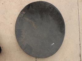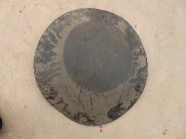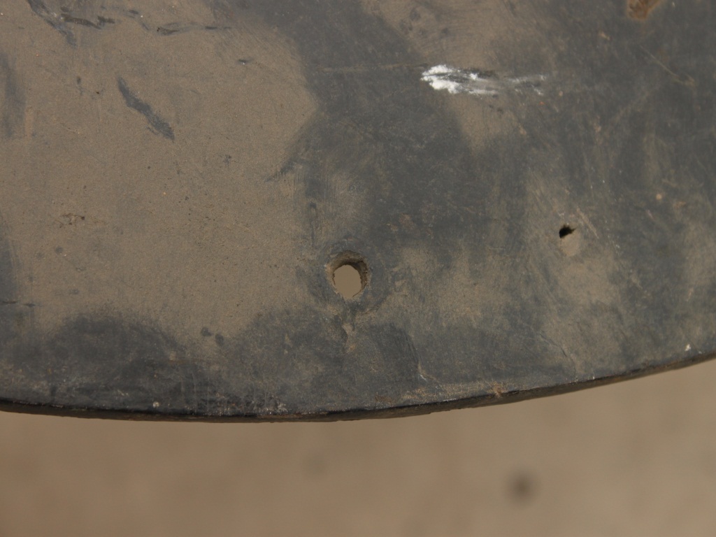 A medium, circular and slightly convex shield of iron alloy. But knobs and pad is missing. Front is badly rusted and the edges are rough. Back is also polished in black colour and there is some rusting.