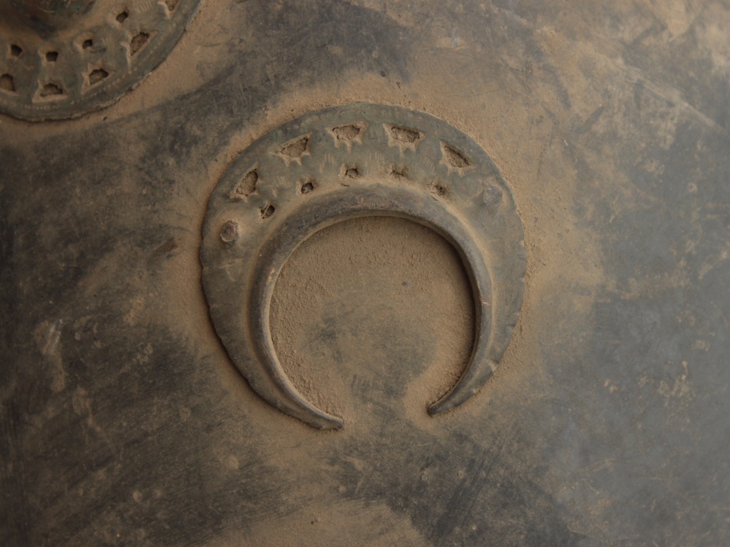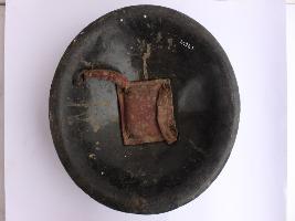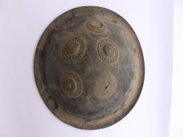 A medium, circular and slightly convex shield of iron alloy. There are four small gilded knobs in the center and the back side of is padded between the knobs. Front is badly rusted and the edges are rough. Back is also polished in black colour and there is some rusting.