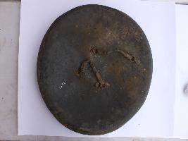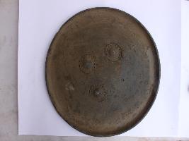 | Description / विवरण | A medium, circular and slightly convex shield of iron alloy. There are four small gilded knobs in the center and the back side of is padded between the knobs but all of that is missing. Front is badly rusted and the edges are rough. Back is also polished in black colour and there is some rusting. |