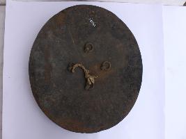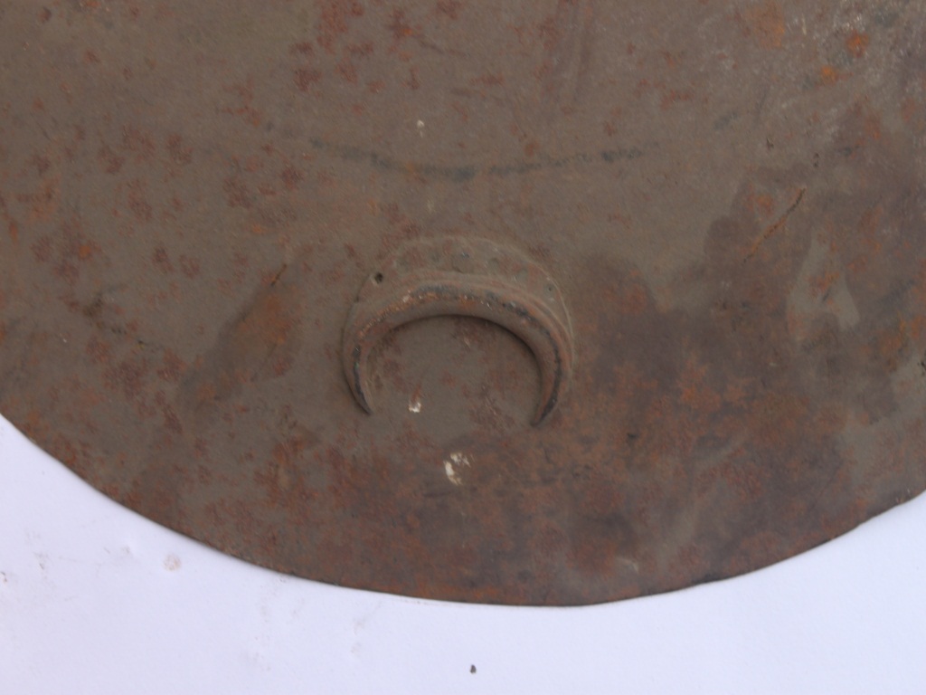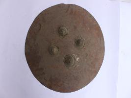 A medium, circular and slightly convex shield of iron alloy. There are four small gilded knobs in the center and the back side of is padded between the knobs. Front is badly rusted and the edges are rough. Back is also polished in black colour and there is some rusting.