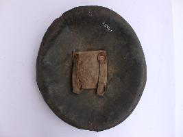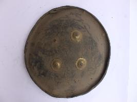 | Description / विवरण | A medium, circular and slightly convex shield of iron alloy. There are three small gilded knobs in the center and the back side of is padded between the knobs but it is damaged and grip is intact. Front is badly rusted and the edges are rough. Back is also polished in black colour and there is some rusting. |