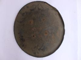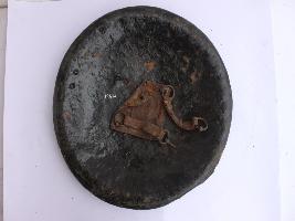 | Description / विवरण | A medium, circular and slightly convex shield of iron alloy. But knobs and pad is missing. Front is badly rusted and the edges are rough. Back is also polished in black colour and there is some rusting. |