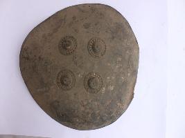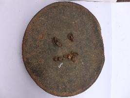 | Description / विवरण | A medium, circular and slightly convex shield of iron alloy. There are four small gilded knobs in the center and the back side of is padded between the knobs. Front is badly rusted and the edges are rough. Back is also polished in black colour and there is some rusting. |