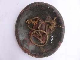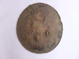 | Description / विवरण | A medium, circular and slightly convex shield of iron alloy. There are two small gilded knobs in the center and the back side of is padded between the knobs but it is damaged and grip is intact. Front is badly rusted and the edges are rough. Back is also polished in black colour and there is some rusting. |