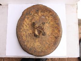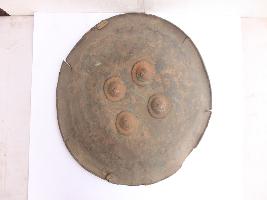 | Description / विवरण | A medium, circular and slightly convex shield of iron alloy. There are four small gilded knobs in the center and the back side of is padded between the knobs. Front is badly rusted and the edges are rough. Back is also polished in black colour and there is some rusting. |