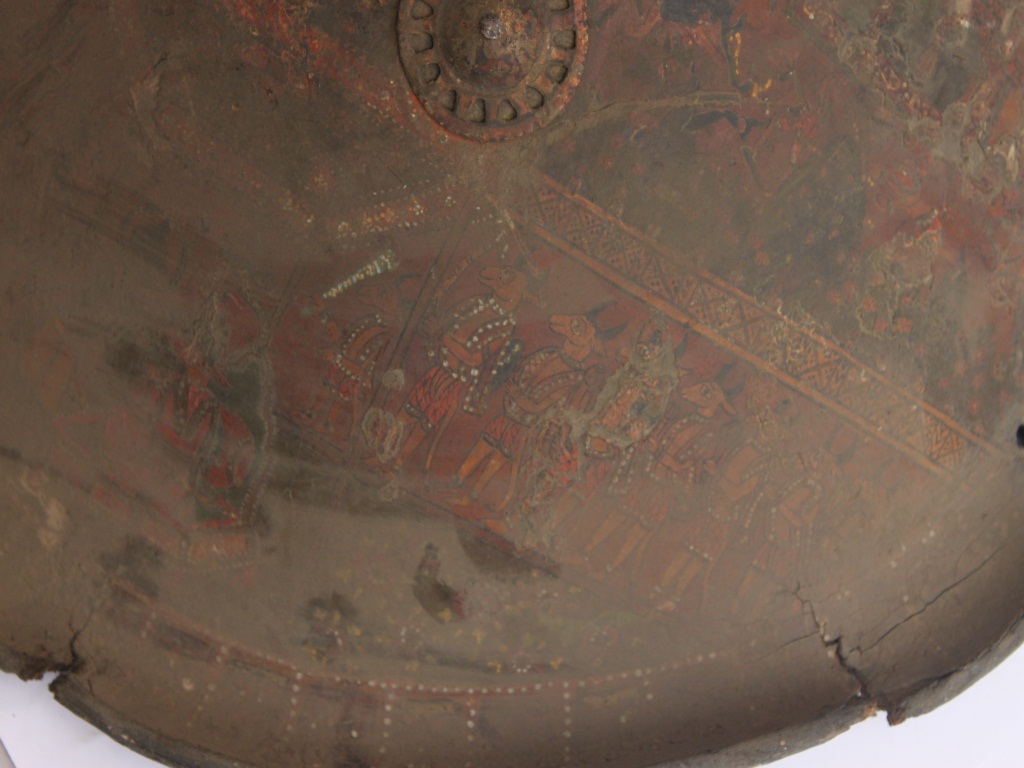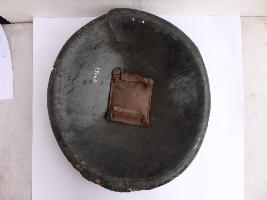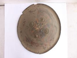 A medium, circular and slightly convex shield of iron alloy. There are four small gilded knobs in the center and the back side of is padded between the knobs. Front is badly rusted and the edges are rough. Back is also polished in black colour and there is some rusting.