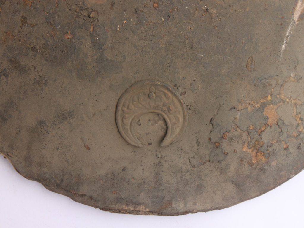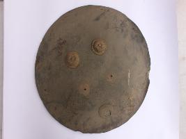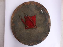A medium, circular and slightly convex shield of iron alloy. There are two small gilded knobs in the center and the back side of is padded between the knobs but it is damaged and grip is intact. Front is badly rusted and the edges are rough. Back is also polished in black colour and there is some rusting.