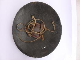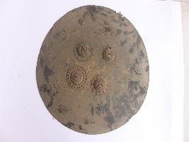 | Description / विवरण | A medium, circular and slightly convex shield of iron alloy. There are four small gilded knobs in the center and the back side of is padded between the knobs. Front is badly rusted and the edges are rough. Back is also polished in black colour and there is some rusting. |
