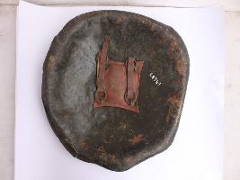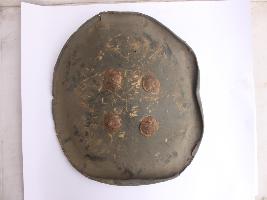 | Description / विवरण | A medium, circular and slightly convex shield of iron alloy. There are four small gilded knobs in the center and the back side of is padded between the knobs. Front is badly rusted and the edges are rough. Back is also polished in black colour and there is some rusting. |