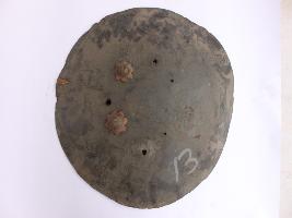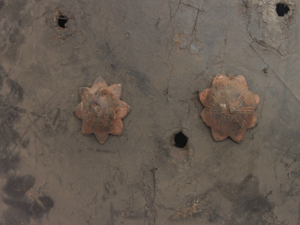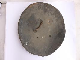 A medium, circular and slightly convex shield of iron alloy. There are two small gilded knobs in the center and the back side of is padded between the knobs but it is damaged and grip is intact. Front is badly rusted and the edges are rough. Back is also polished in black colour and there is some rusting.