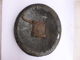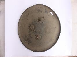 | Description / विवरण | A medium, circular and slightly convex shield of iron alloy. There are three small gilded knobs in the center and the back side of is padded between the knobs but it is damaged and grip is intact. Front is badly rusted and the edges are rough. Back is also polished in black colour and there is some rusting. |