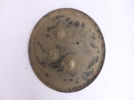 | Description / विवरण | A medium, circular and slightly convex shield of iron alloy. There are three small gilded knobs in the center and the back side of is padded between the knobs but it is damaged and grip is intact. Front is badly rusted and the edges are rough. Back is also polished in black colour and there is some rusting. |