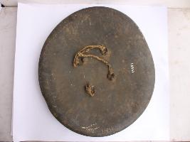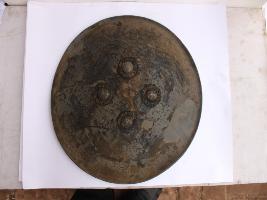 | Description / विवरण | A medium, circular and slightly convex shield of iron alloy. There are four small gilded knobs in the center and the back side of is padded between the knobs. Front is badly rusted and the edges are rough. Back is also polished in black colour and there is some rusting. |