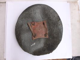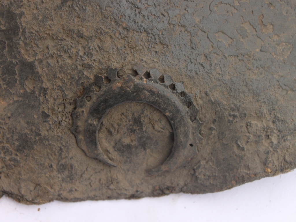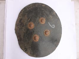 A medium, circular and slightly convex shield of iron alloy. There are four small gilded knobs in the center and the back side of is padded between the knobs. Front is badly rusted and the edges are rough. Back is also polished in black colour and there is some rusting.