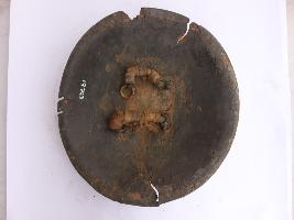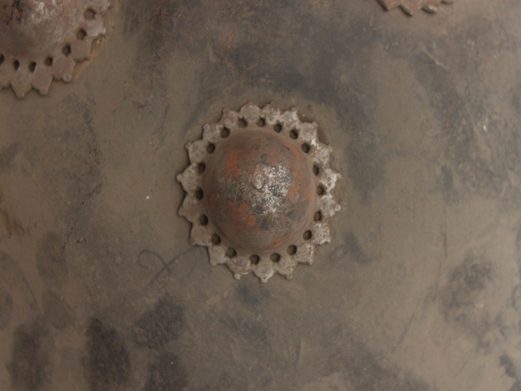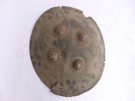 A medium, circular and slightly convex sheild of iron alloy. There are four small guilded knobs in the center and the back side of is padded between the knobs. Front is badly rusted and the edges are rough. Back is also polished in black colour and there is some rusting. All the four knobs are designed.