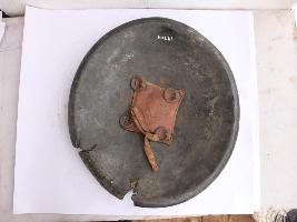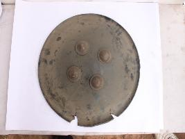 | Description / विवरण | A medium, circular and slightly convex sheild of iron alloy. There are four small guilded knobs in the center and the back side of is padded between the knobs. Front is badly rusted and the edges are rough. Back is also polished in black colour and there is some rusting. |