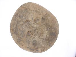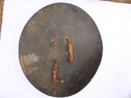 | Description / विवरण | A medium, circular and slightly convex sheild of iron alloy. There are four small guilded knobs in the center and the back side of is padded between the knobs but pad is missing. Front is badly rusted and the edges are rough. Back is also polished in black colour and there is some rusting. |