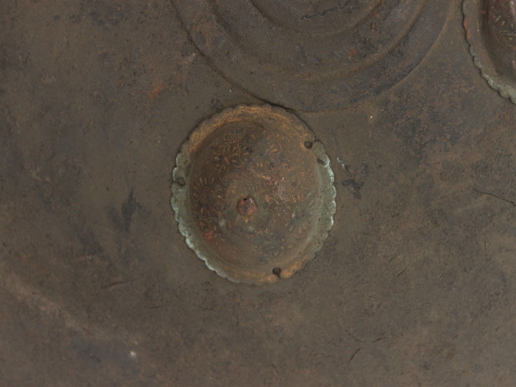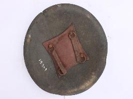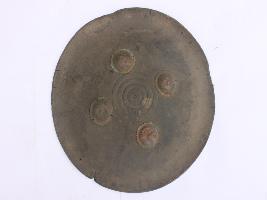 A medium, circular and slightly convex sheild of iron alloy. There are four small guilded knobs in the center and the back side of is padded between the knobs. Front is badly rusted and the edges are rough. Back is also polished in black colour and there is some rusting.