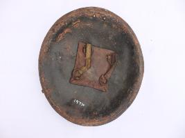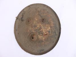 | Description / विवरण | A medium, circular and slightly convex sheild of iron alloy. There are four small guilded knobs in the center out of which two are missing and the back side of is padded between the knobs. There are two strings attached as grip.Front is badly rusted and the edges are rough. Back is also polished in black colour and there is some rusting. |