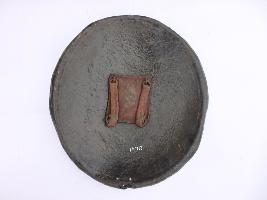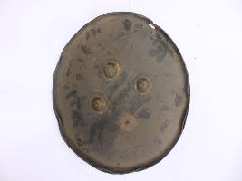 | Description / विवरण | A medium, circular and slightly convex sheild of iron alloy. There are four small guilded knobs in the center out of which one is missing and the back side of is padded between the knobs. There are two strings attached as grip.Front is badly rusted and the edges are rough. Back is also polished in black colour and there is some rusting. |