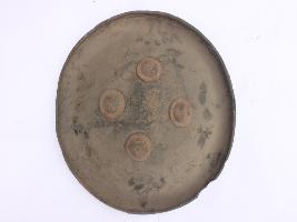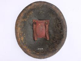 | Description / विवरण | A medium, circular and slightly convex sheild of iron alloy. There are four small guilded knobs in the center and the back side of is padded between the knobs. Front is badly rusted and the edges are rough. Back is also polished in black colour and there is some rusting. |