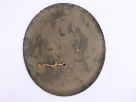 | Description / विवरण | A medium, circular and slightly convex sheild of iron alloy. There are four small guilded knobs in the center but all of them are missing and the back side of is padded between the knobs, that is missing. There are two strings attached as grip. Front is badly rusted and the edges are rough. Back is also polished in black colour and there is some rusting. |