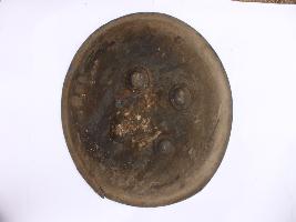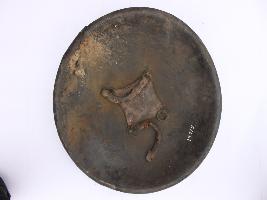 | Description / विवरण | A medium, circular and slightly convex sheild of iron alloy. There are four small guilded knobs in the center and the back side of is padded between the knobs. Front is badly rusted and the edges are rough. Back is also polished in black colour and there is some rusting. |
