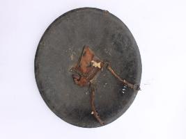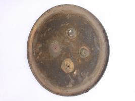 | Description / विवरण | A medium, circular and slightly convex sheild of iron alloy. There are four small guilded knobs in the center out of which two are missing and the back side of is padded between the knobs. There are two strings attached as grip.Front is badly rusted and the edges are rough. Back is also polished in black colour and there is some rusting. |