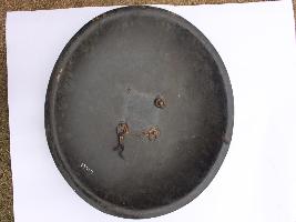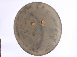 | Description / विवरण | A medium, circular and slightly convex sheild of iron alloy. There are four small guilded knobs in the center out of which two are missing and the back side of is padded between the knobs but it is missing. There are two strings attached as grip. Front is badly rusted and the edges are rough. Back is also polished in black colour and there is some rusting. |