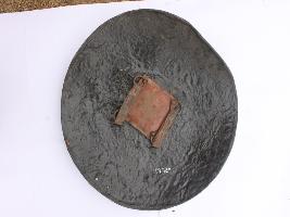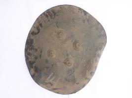 | Description / विवरण | A medium, circular and slightly convex sheild of iron alloy. There are four small guilded knobs in the center and the back side of is padded between the knobs. Front is badly rusted and the edges are rough. Back is also polished in black colour and there is some rusting. |
