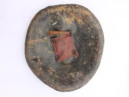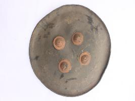 | Description / विवरण | A medium, circular and slightly convex sheild of iron alloy. There are four small guilded knobs in the center and the back side of is padded between the knobs. Front is badly rusted and the edges are rough. Back is also polished in black colour and there is some rusting. |