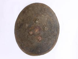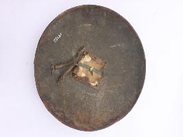 | Description / विवरण | A medium, circular and slightly convex sheild of iron alloy. There are four small guilded knobs in the center and the back side of is padded between the knobs. Front is badly rusted and the edges are rough. Back is also polished in black colour and there is some rusting. |