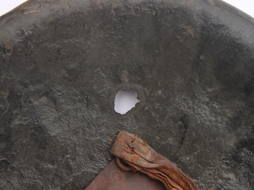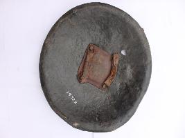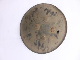 A medium, circular and slightly convex sheild of iron alloy. There are four small guilded knobs in the center and the back side of is padded between the knobs. Front is badly rusted and the edges are rough. Back is also polished in black colour and there is some rusting.