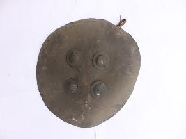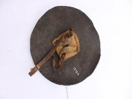 | Description / विवरण | A medium, circular and slightly convex sheild of iron alloy. There are four small guilded knobs in the center and the back side of is padded between the knobs. Front is badly rusted and the edges are rough. Back is also polished in black colour and there is some rusting. |