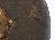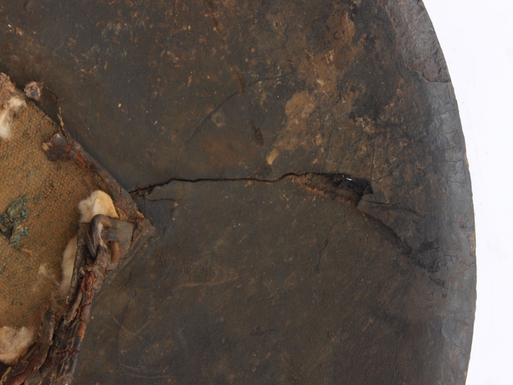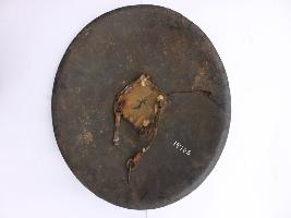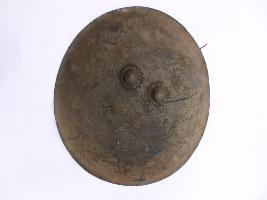 A medium, circular and slightly convex sheild of iron alloy. There are four small guilded knobs in the center out of which two are missing and the back side of is padded between the knobs. There are two strings attached as grip.Front is badly rusted and the edges are rough. Back is also polished in black colour and there is some rusting. There is a major crack.