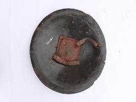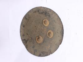 | Description / विवरण | A medium, circular and slightly convex sheild of iron alloy. There are four small guilded knobs in the center out of which one is missing and the back side of is padded between the knobs. There are two strings attached as grip.Front is badly rusted and the edges are rough. Back is also polished in black colour and there is some rusting. |