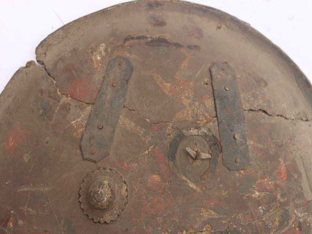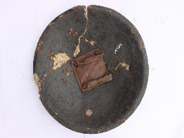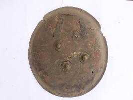 A medium, circular and slightly convex sheild of iron alloy. There are four small guilded knobs in the center out of which one is missing and the back side of is padded between the knobs. There are two strings attached as grip.Front is badly rusted and the edges are rough. Back is also polished in black colour and there is some rusting. There are two metal strips screwed on the top to enjoin the broken part.