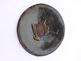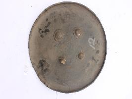 | Description / विवरण | A medium, circular and slightly convex sheild of iron alloy. There are four small guilded knobs in the center and the back side of is padded between the knobs. Front is badly rusted and the edges are rough. Back is also polished in black colour and there is some rusting. |