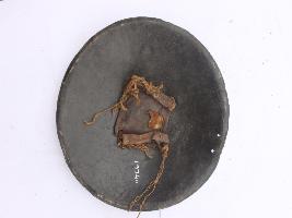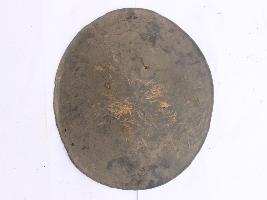 | Description / विवरण | A medium, circular and slightly convex sheild of iron alloy. There are four small guilded knobs in the center out of which all are missing and the back side of is padded between the knobs. There are two strings attached as grip.Front is badly rusted and the edges are rough. Back is also polished in black colour and there is some rusting. |